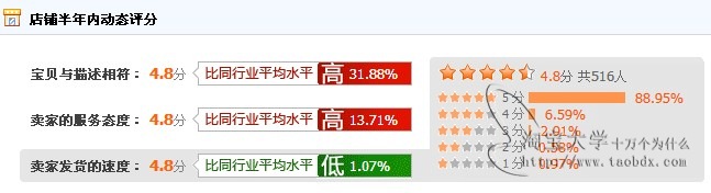 店铺动态评分是会员在淘宝网交易成功后,仅限使用买家身份的淘宝网会员对本次交易的使用卖家身份的淘宝网会员进行如下四项评分:宝贝与描述相符、卖家的服务态度、卖家发货的速度、物流公司的服务。每项店铺评分取连续六个月内所有买家给予评分的算术平均值,如下图: